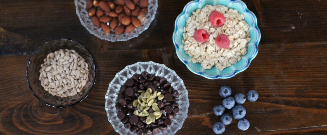 The great creamy flavor from all natural peanut butter combined with the tartness of dried apples...a classic pair! We threw in some almonds for calcium and crunch, and poured in the oats for cardiovascular health and their chewy goodness.